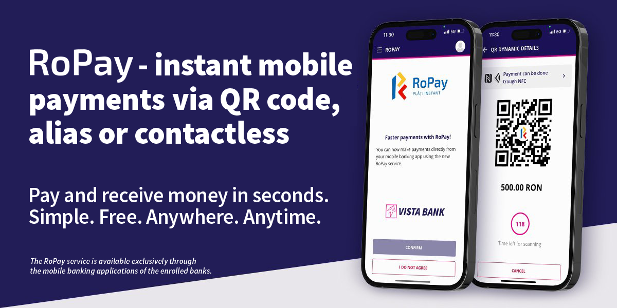 “RoPay is a solution designed for the modern customer, who expects a fast, simple and secure payment experience. Completing the integration of all RoPay payments for individuals gives Vista Bank clients the freedom to choose the payment method that best suits them, from a wide range of payment scenarios, both in physical and online environments. We continue to invest in digital solutions that make everyday banking easier and more intuitive,” – said Raluca Dobre, Alternative Channels and Transformation Manager, Vista Bank.